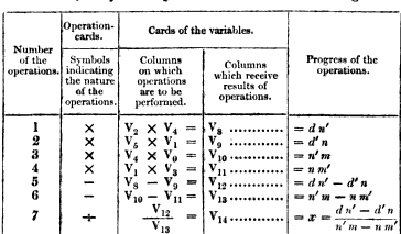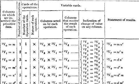 In the rest of this post I’ll describe two of these formats, tables and microcode. The punched card format has a separate post which is linked at the end. First though, a quick note on sources. My source for most of this post is some excellent articles by Allan Bromley: The Evolution of Babbage’s Calculating Engines from 1987 and Babbage’s Analytical Engine Plans 28 and 28a – The Programmer’s Interface from 2000. If you want more information these are the articles to read. (Obscenely they are both behind IEEE’s paywall which I suspect is one reason they’re not as widely read as they deserve to be.)